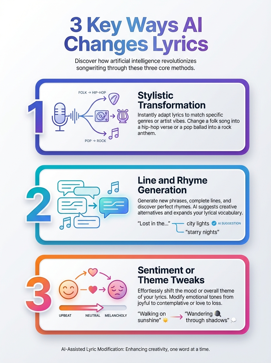 A concise visual guide to how AI can change lyrics. It highlights three key approaches: generation, transformation, and personalization.
